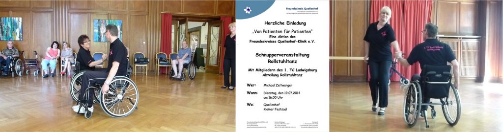 Ein anders Beispiel für diese Initiativen war die von einem Patienten organisierte Vorstellung von Rollstuhltanz im Juli 2014 durch die Abteilung Rollstuhltanz des 1. TC Ludwigsburg. Der Nachmittag bot neben der Vorführung verschiedener Varianten des Rollstuhltanzes (nur Rollstühle oder Rollstühle und Fußgänger) auch die Möglichkeit selbst mit dem eigenen Rollstuhl erste Tanzerfahrungen zu machen. Die beiden folgenden kurzen Videoaufnahmen sind am 19. Juli 2014 entstanden.
